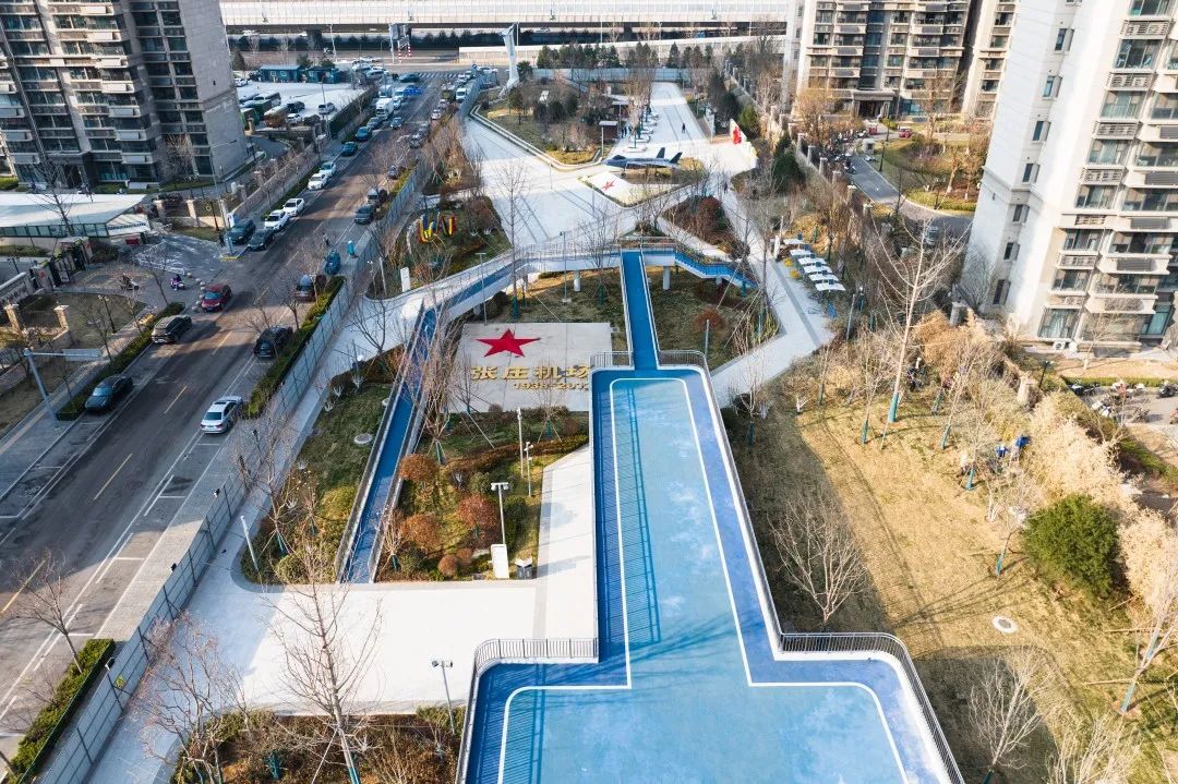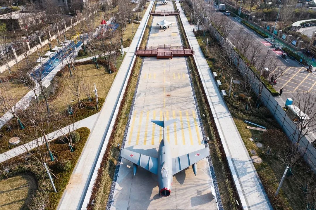 公園南區(qū)入口打造文化長廊,通過展示中國戰(zhàn)機(jī)發(fā)展史讓市民了解空軍文化;結(jié)合原有170米長水泥跑道,通過景觀手法進(jìn)行二次設(shè)計(jì),融合機(jī)場跑道符號(hào)、導(dǎo)航等設(shè)施還原機(jī)場跑道場景,沿跑道科普展示曾在張莊機(jī)場服役的戰(zhàn)機(jī)模型,進(jìn)行航空科普、國防軍事及愛國主義教育。