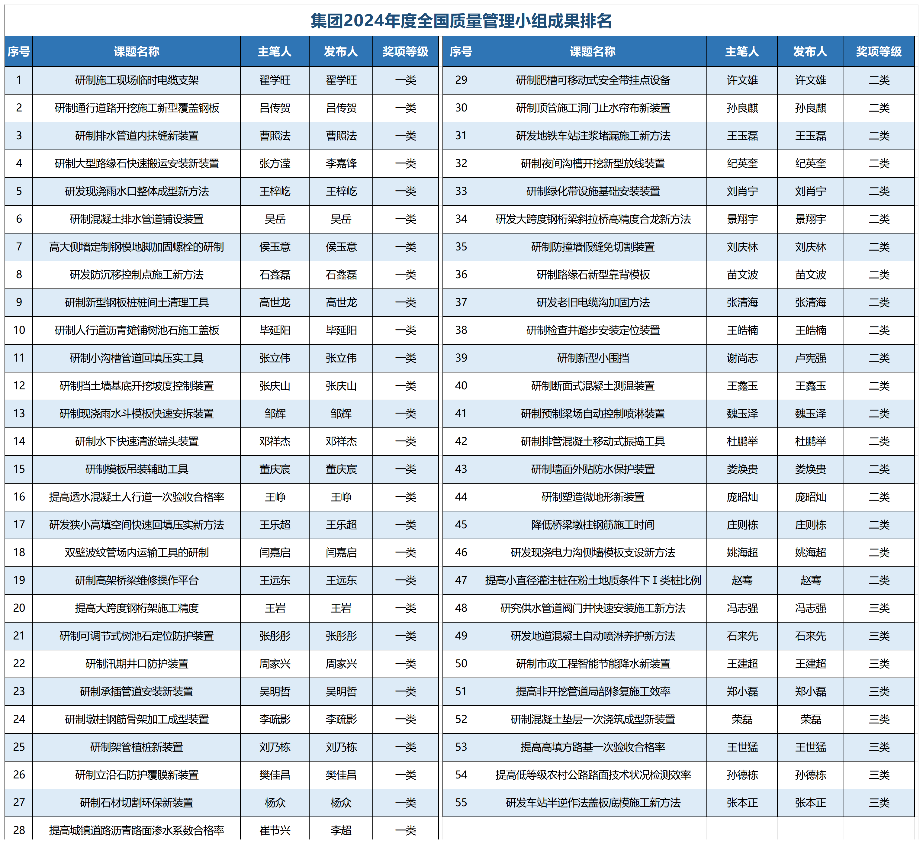 在本次市政工程建設(shè)質(zhì)量管理活動(dòng)中,城建集團(tuán)公司發(fā)布QC成果55項(xiàng),其中,一類(lèi)成果28項(xiàng)、二類(lèi)成果19項(xiàng)、三類(lèi)成果8項(xiàng);發(fā)布質(zhì)量信得過(guò)班組成果14項(xiàng),其中,示范級(jí)班組8項(xiàng)、專(zhuān)業(yè)級(jí)班組5項(xiàng)、推進(jìn)級(jí)班組1項(xiàng)。