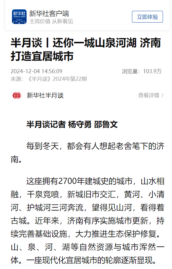 這座擁有2700年建城史的城市,山水相融,千泉競噴,新城舊市交匯,黃河、小清河、護(hù)城河三河奔流,望得見山河,看得著古城。近年來,濟(jì)南有序?qū)嵤┏鞘懈?,持續(xù)完善基礎(chǔ)設(shè)施,大力推進(jìn)生態(tài)保護(hù)修復(fù)。山、泉、河、湖等自然資源與城市渾然一體。一座現(xiàn)代化宜居城市的輪廓逐漸顯現(xiàn)。