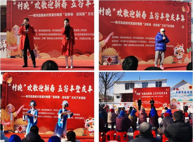 由濟(jì)南廣播電視臺(tái)文旅體育頻道、濟(jì)南市呂劇院、濟(jì)南職業(yè)學(xué)院、濟(jì)南江湖藝社等志愿者聯(lián)合村民共同組織的“村晚”歡歌迎新春 五谷豐登慶豐年——商河縣路陳村首屆村晚暨“迎新春·送祝福”文化演出活動(dòng)在村委會(huì)廣場(chǎng)舉行,演出節(jié)目豐富多彩,既有傳統(tǒng)的戲曲、曲藝表演,也有現(xiàn)代的歌舞節(jié)目,充分展現(xiàn)了鄉(xiāng)村文化的獨(dú)特魅力。