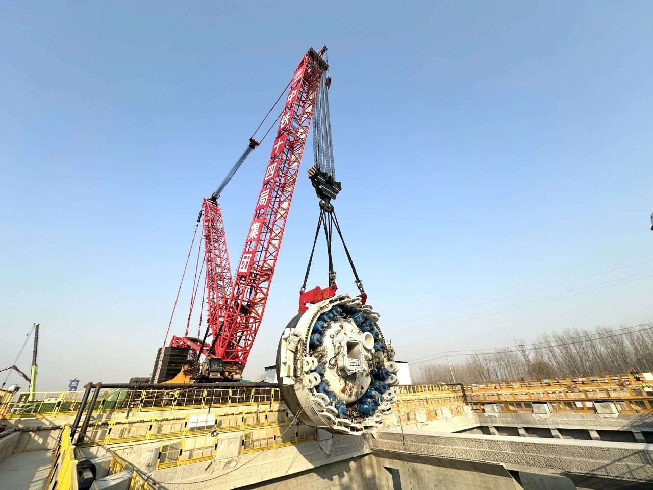 用于濟(jì)南市航天大道穿黃隧道施工的“啟航號(hào)”盾構(gòu)機(jī)長(zhǎng)達(dá)161米,總重量約4295噸,盾構(gòu)機(jī)直徑15.06米。此次吊裝下井的主驅(qū)動(dòng)寬7.6米、重390噸,是整個(gè)盾構(gòu)機(jī)的核心部件,也是整個(gè)盾構(gòu)機(jī)吊裝組裝階段最為關(guān)鍵的一環(huán)。