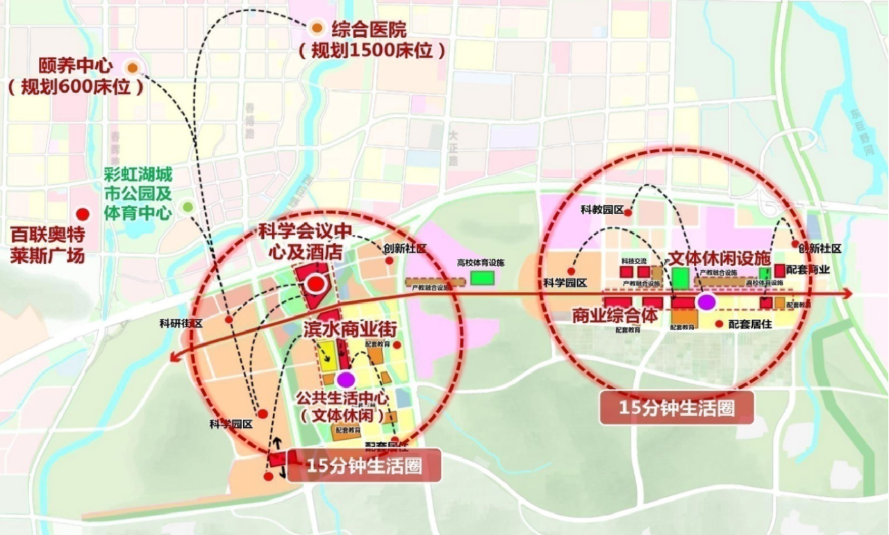本區(qū)域配套設(shè)施完善,統(tǒng)籌共享城市級(jí)醫(yī)療、文體及商業(yè)設(shè)施。以科創(chuàng)城為中心,兩公里范圍內(nèi)規(guī)劃建設(shè)有1500床位的綜合醫(yī)院、600床位的頤養(yǎng)中心、占地40公頃的彩虹湖城市公園以及建筑面積10萬(wàn)平方米的奧特萊斯商業(yè)綜合體等。科創(chuàng)城內(nèi)部結(jié)合景觀水系,規(guī)劃建設(shè)共享服務(wù)帶,集中設(shè)置眾創(chuàng)平臺(tái)、文體活動(dòng)中心、餐飲商業(yè)、社區(qū)醫(yī)院等,并同步規(guī)劃建設(shè)可容納2000人的會(huì)議中心和1000客房的國(guó)際酒店。
