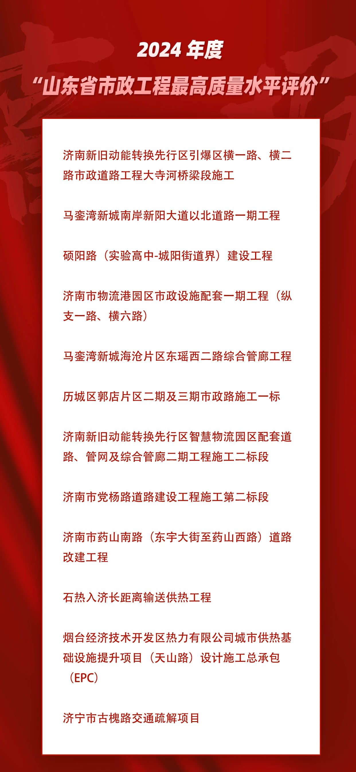 近日,山東省市政行業(yè)協(xié)會發(fā)布了《關(guān)于公布2024年度通過市政工程最高質(zhì)量水平評價(jià)工程的通知》,建設(shè)集團(tuán)及其所屬子公司參與的12項(xiàng)工程獲評2024年度山東省市政工程最高質(zhì)量水平評價(jià)。